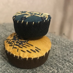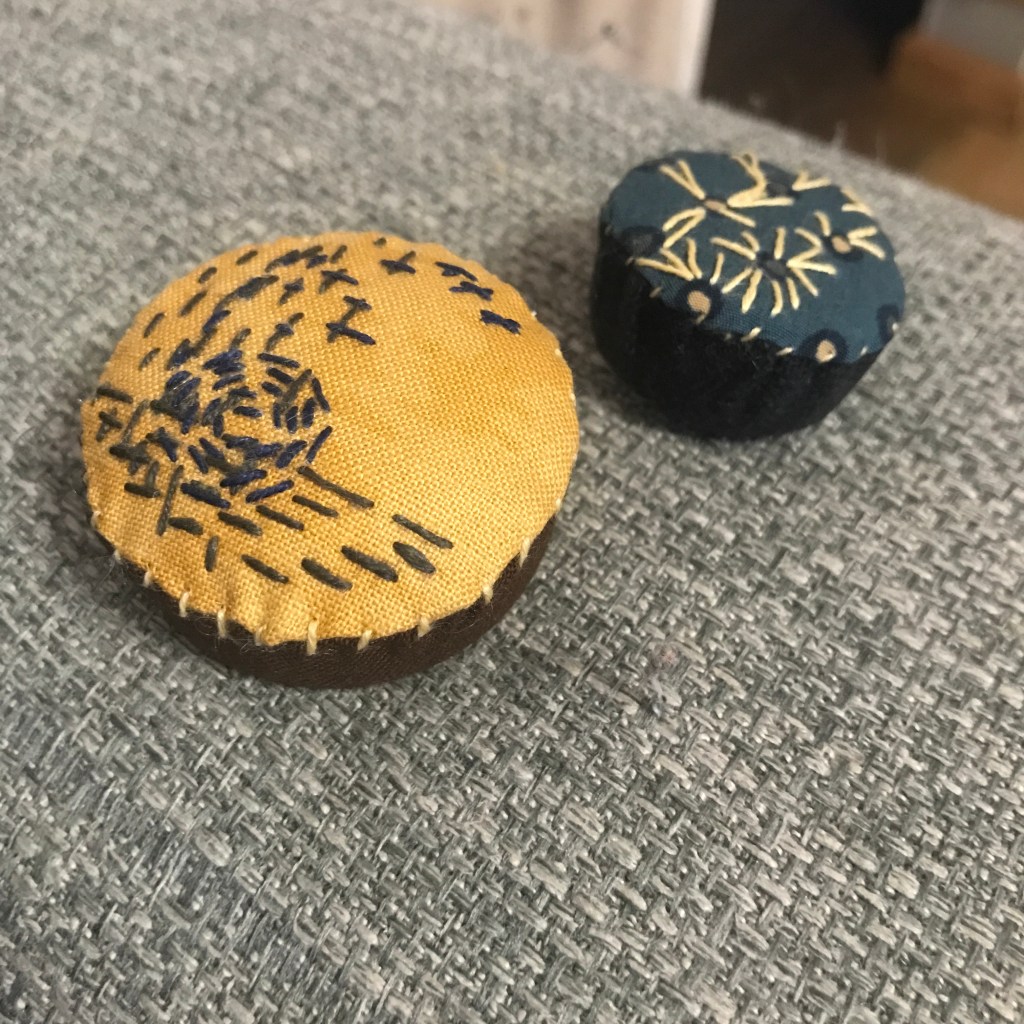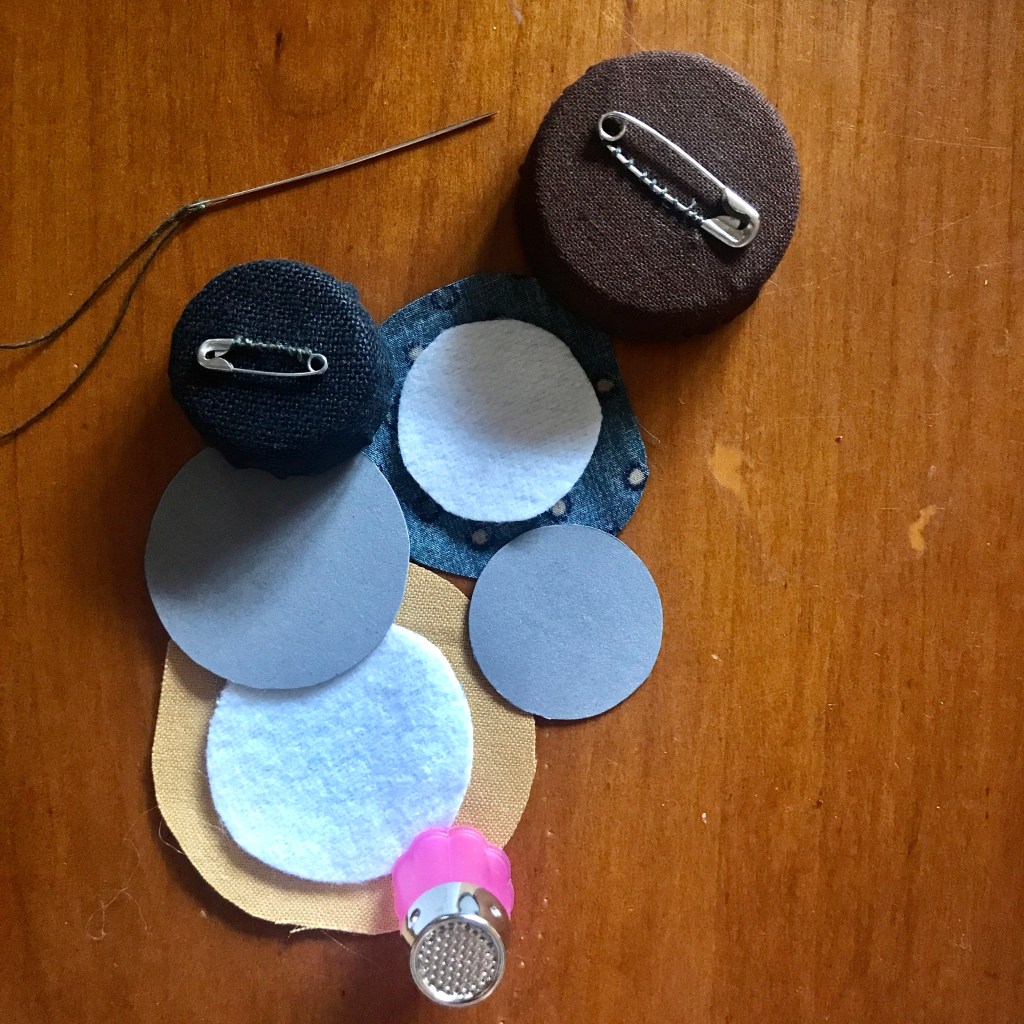 Slow stitched brooches made of bottle caps and scrap fabric with Heidi Parkes.