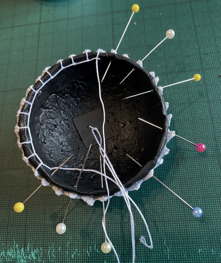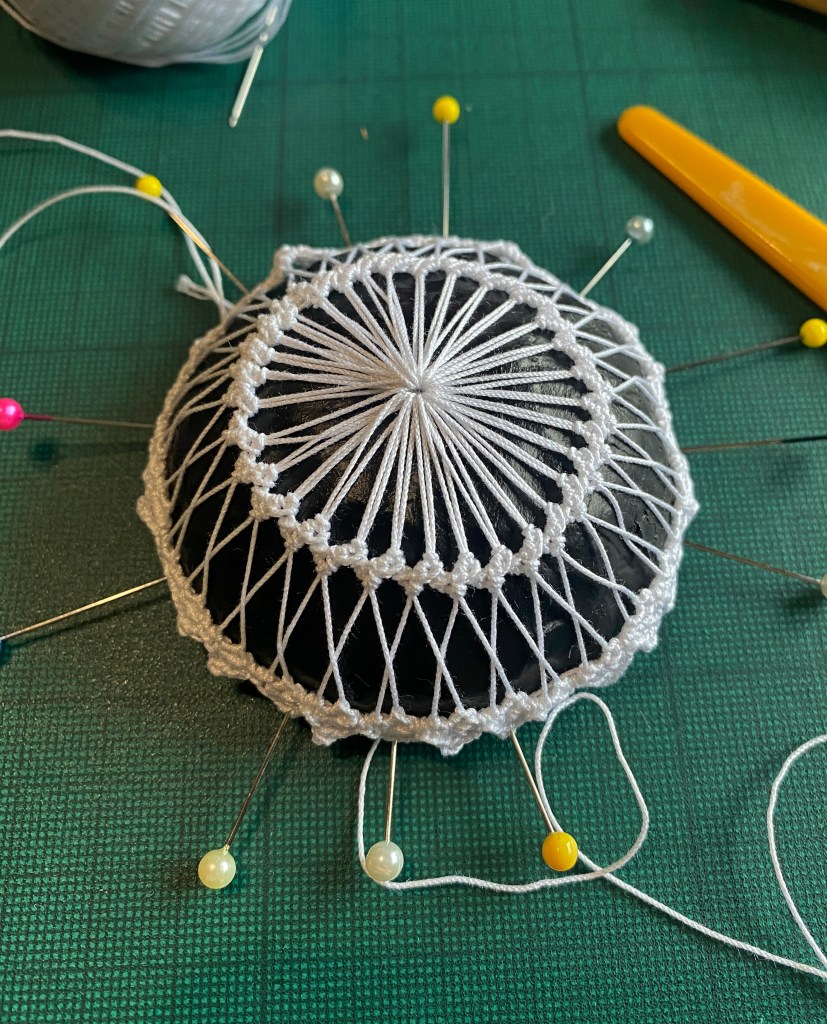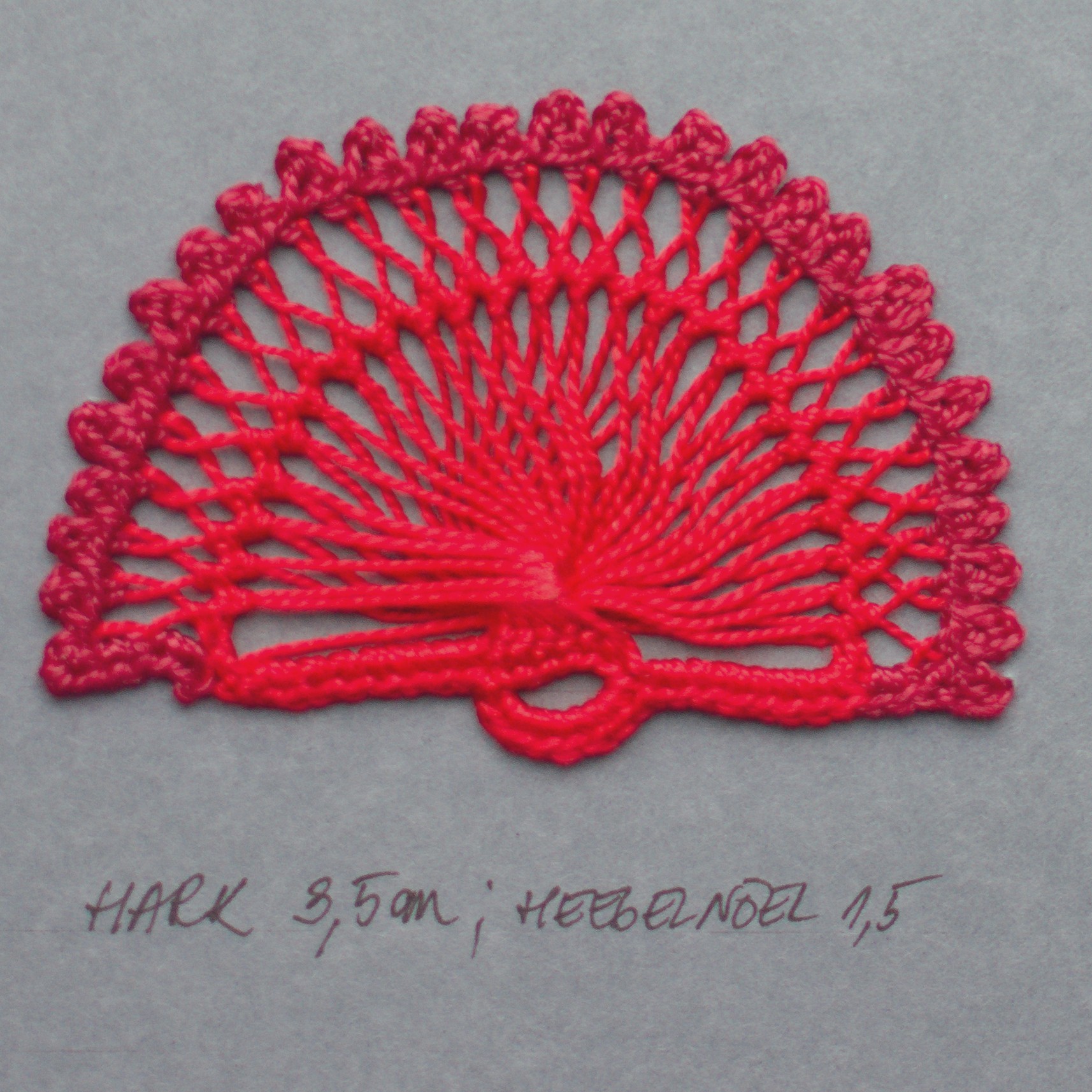 Kasutasin 4 cm laiusega harki, nr 20 puuvillast niiti (Lizbeth) ja 0,75 heegelnõela. Hargile tegin 32 aasa, ühenduseks kasutasin kinnissilmuseid.