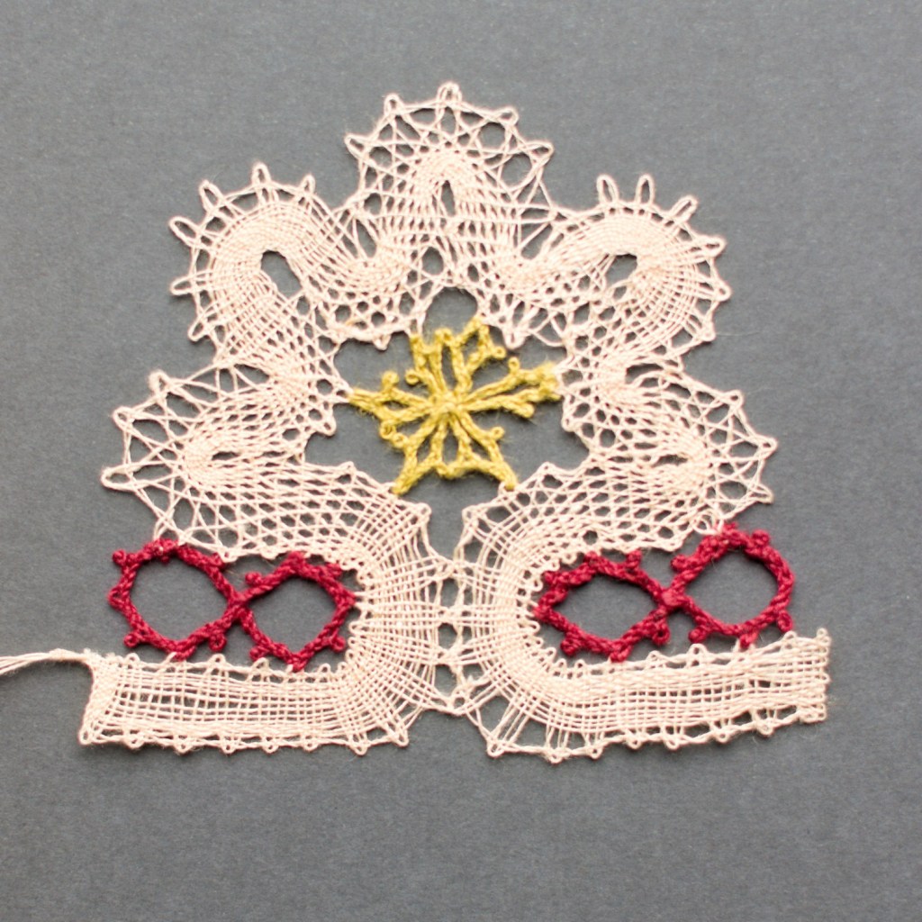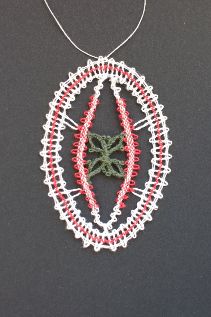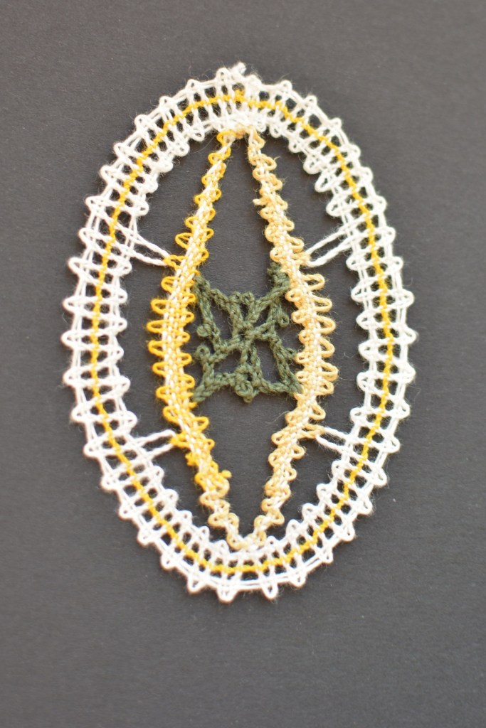 Välimine ring servadest linalöökidega, värviline niit täislöögiga. Sisemine ring linalöökidega, keskel palmikud.
