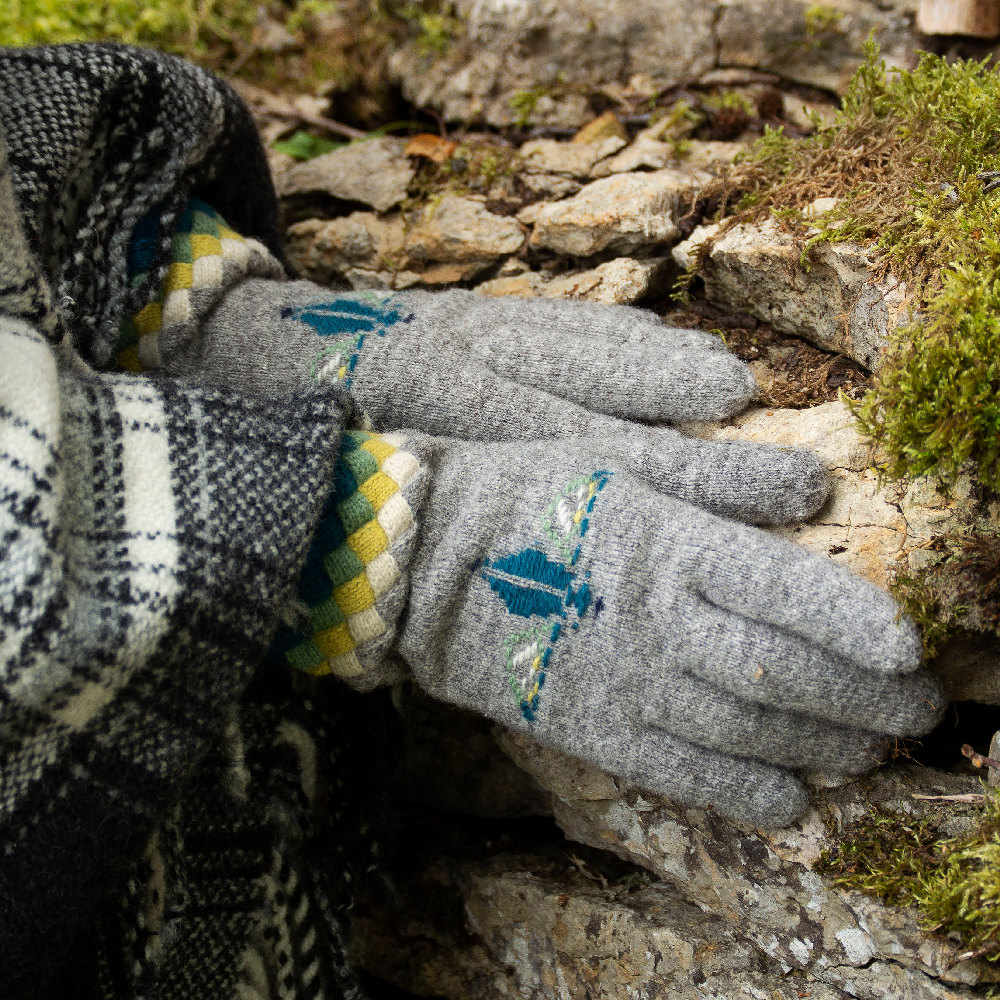 Knitted woolen gloves with entrelac cuffs and inlaid bug pattern.